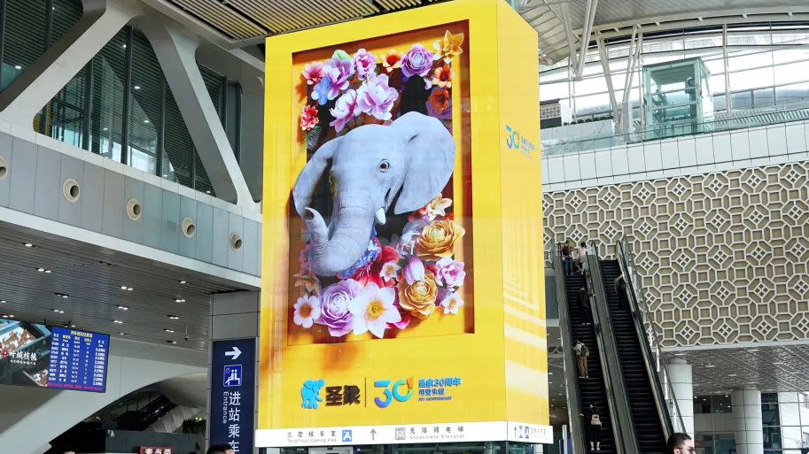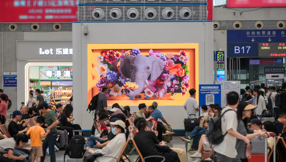 不(bù)同于商圈的(de)“巨幕奇觀”,高(gāo)鐵(tiě)場(chǎng)景下(xià)則更加注重“即時(shí)互動效果”與沉浸式觀感體(tǐ)驗。通(tōng)過兆β訊高(gāo)清刷屏媒體(tǐ),憨态可(kě)掬的(de)小(xiǎo)象撷花(huā)贈予往來(lái)旅客,“人(rén)與自(zì)然”間(jiān)溫馨和(&hé)諧的(de)一(yī)幕自(zì)然融入高(gāo)鐵(tiě)場(chǎng)景,引領旅客邂逅時(shí)空(kōng)奇遇,打±造出與巨幕LED截然不(bù)同的(de)近(jìn)距離(lí)互動體(tǐ)驗和(hé)人(rén)屏互動性。